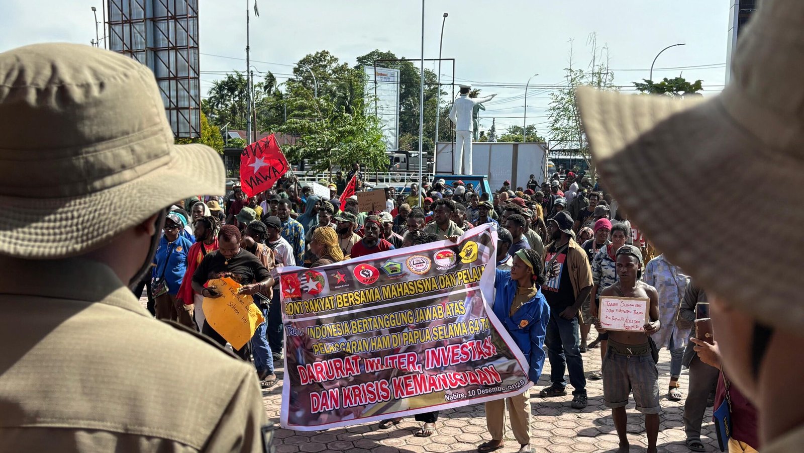Front Rakyat Papua (FRP) bersama mahasiswa dan pelajar menggelar aksi memperingati Hari Hak Asasi Manusia (HAM) Sedunia pada Rabu (10/12/2025). (Foto: Yusran/IN)