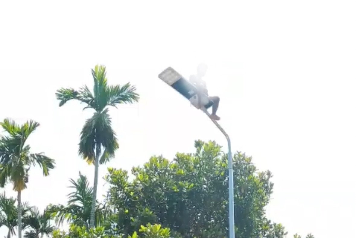 Seorang pria berinisial AMR (22) nekat naik ke atas tiang lampu jalan dan diduga melakukan percobaan bunuh diri.
