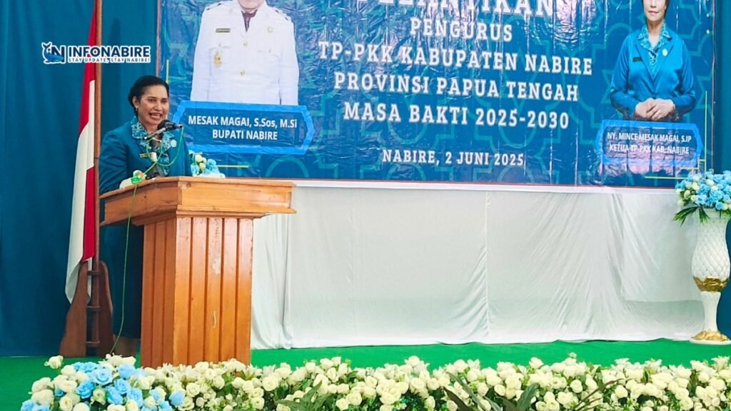 NABIRE – Mince Magai Reprep resmi dikukuhkan sebagai Ketua Tim Penggerak PKK Kabupaten Nabire masa bakti 2025–2030. Acara pengukuhan dan pelantikan pengurus digelar pada Senin, (2/6/2025) pukul 09.00 WIT, bertempat di Aula GKI Maranatha, Malompo, Nabire, Papua Tengah.