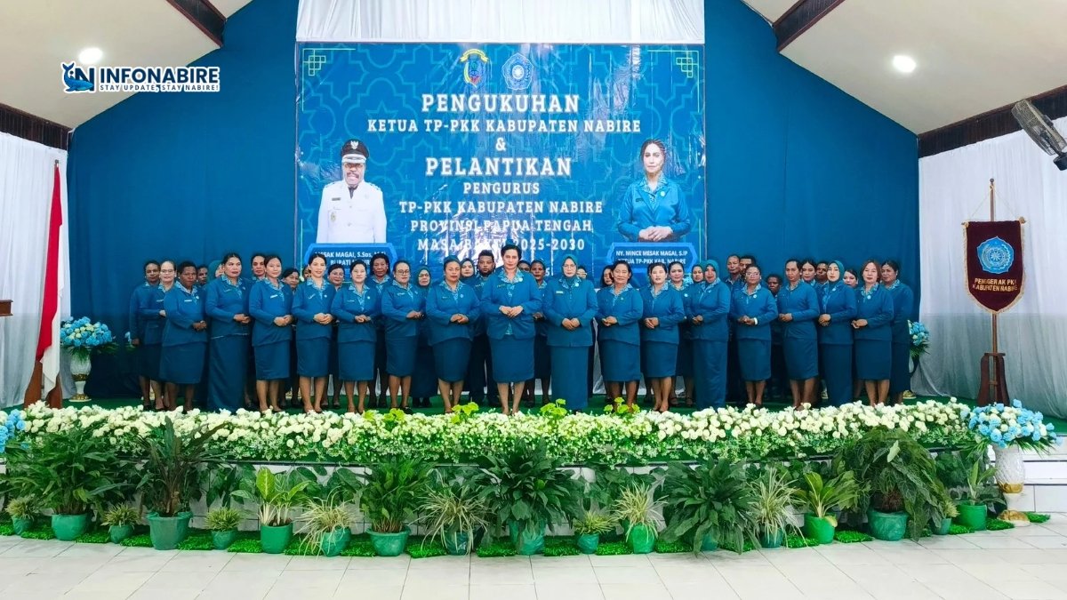 Pengukuhan TP-PKK ini turut dihadiri oleh Bupati Nabire Mesak Magai, S.Sos., M.Si., unsur Forkopimda, tokoh agama, tokoh perempuan, serta para undangan dari berbagai organisasi wanita.