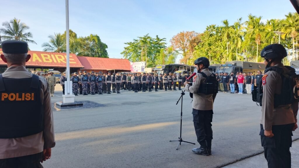 NABIRE – Polres Nabire menggelar apel kesiapan pengamanan dalam rangka menjaga harkamtibmas pada Selasa (09/12) sore di halaman Mapolres Nabire. Kegiatan ini dipimpin Kapolres Nabire, AKBP Samuel D. Tatiratu, S.I.K, dan diikuti PJU Polres Nabire, personel TNI-Polri, Satpol PP Provinsi Papua Tengah dan Satpol PP Kabupaten Nabire.